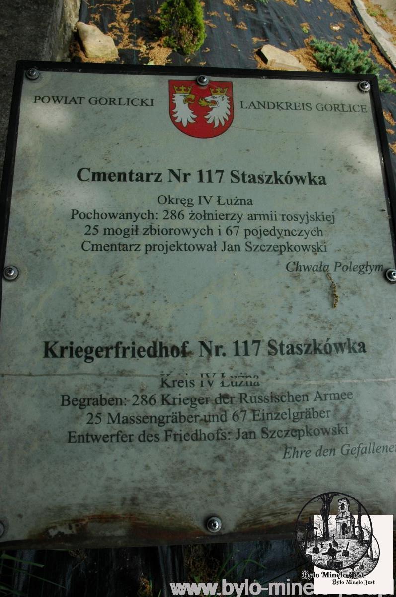 Cmentarz nr 117 w Staszkówce leży przy drodze prowadzącej z tej miejscowości do Ciężkowic. Został on zaprojektowany, podobnie jak cmentarz nr 119, przez Jana Szczepkowskiego, stąd też zapewne spore podobieństwo obu cmentarzy. Obydwa ogrodzone są w tylnej części jednolitym murem kamiennym, a po bokach i od frontu ogrodzenie ma formę kamiennych słupów pomiędzy którymi znajdują się wykonane z drewna przęsła. Również forma nagrobków na obu cmentarzach jest taka sama – groby zbiorowe oznaczone są potrójnymi krzyżami lotaryńskimi osadzonymi na trójstopniowym betonowym cokole, groby pojedyncze oznaczone są pojedynczym krzyżem lotaryńskim na betonowym cokole.