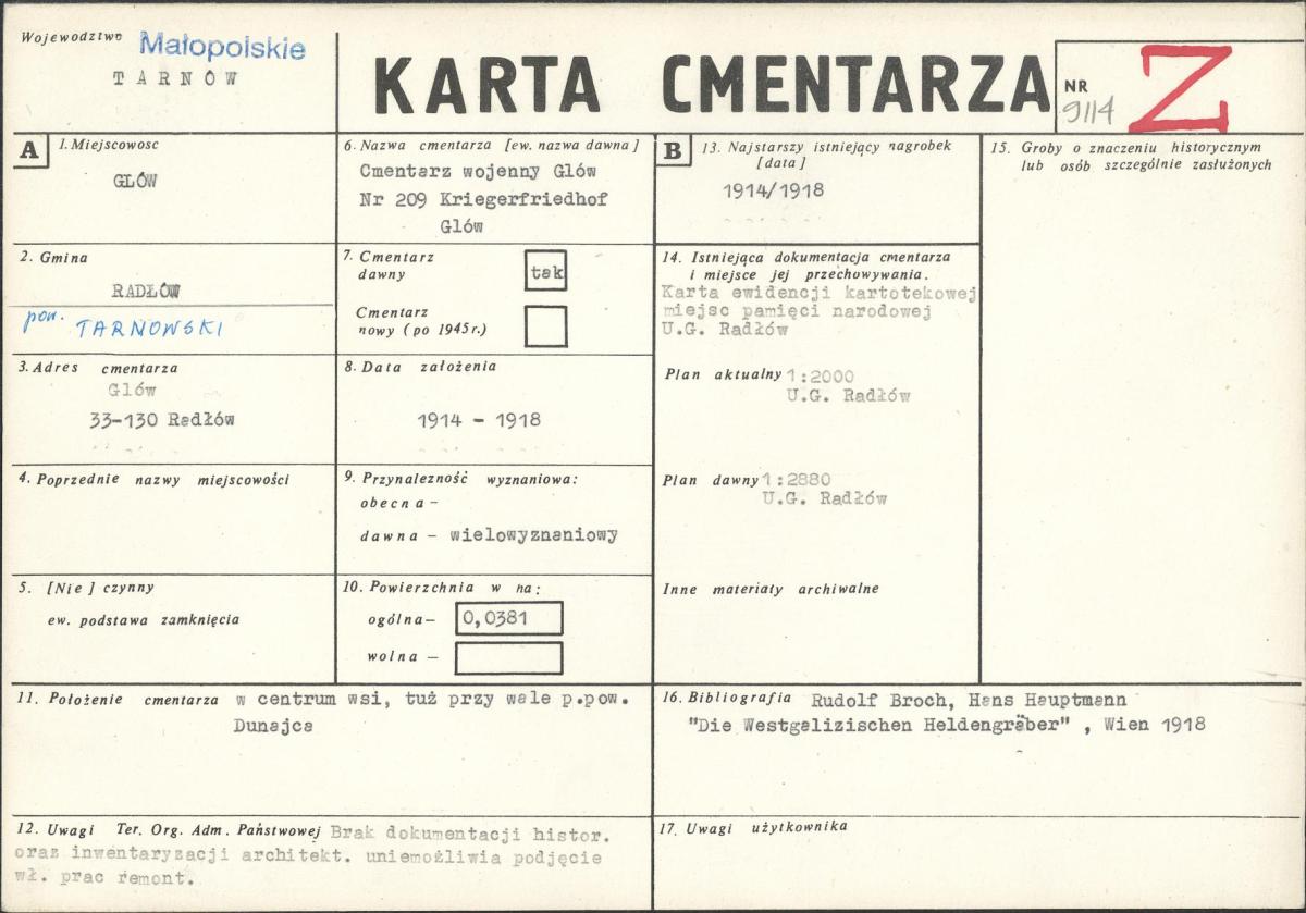 Cmentarz wojenny nr 209 w Glowie został wpisany do ewidencji zabytków dopiero 14 października 1996 roku.